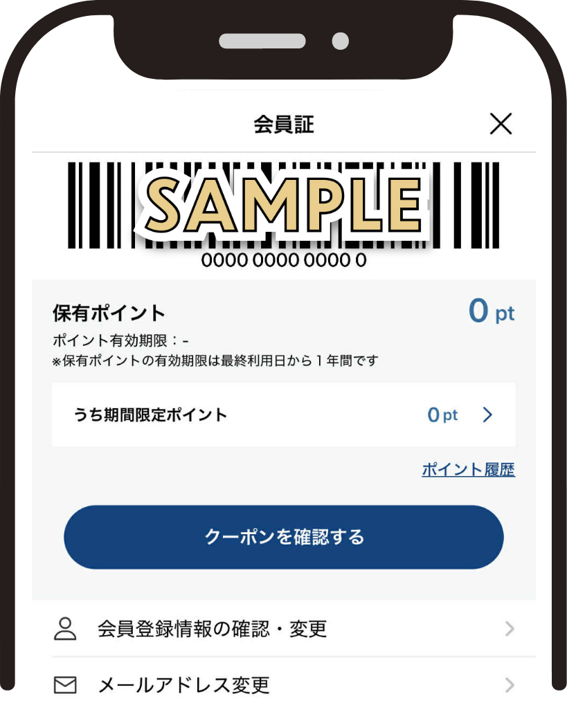 アプリを起動し、ホーム画面右下の「会員証」をタップ